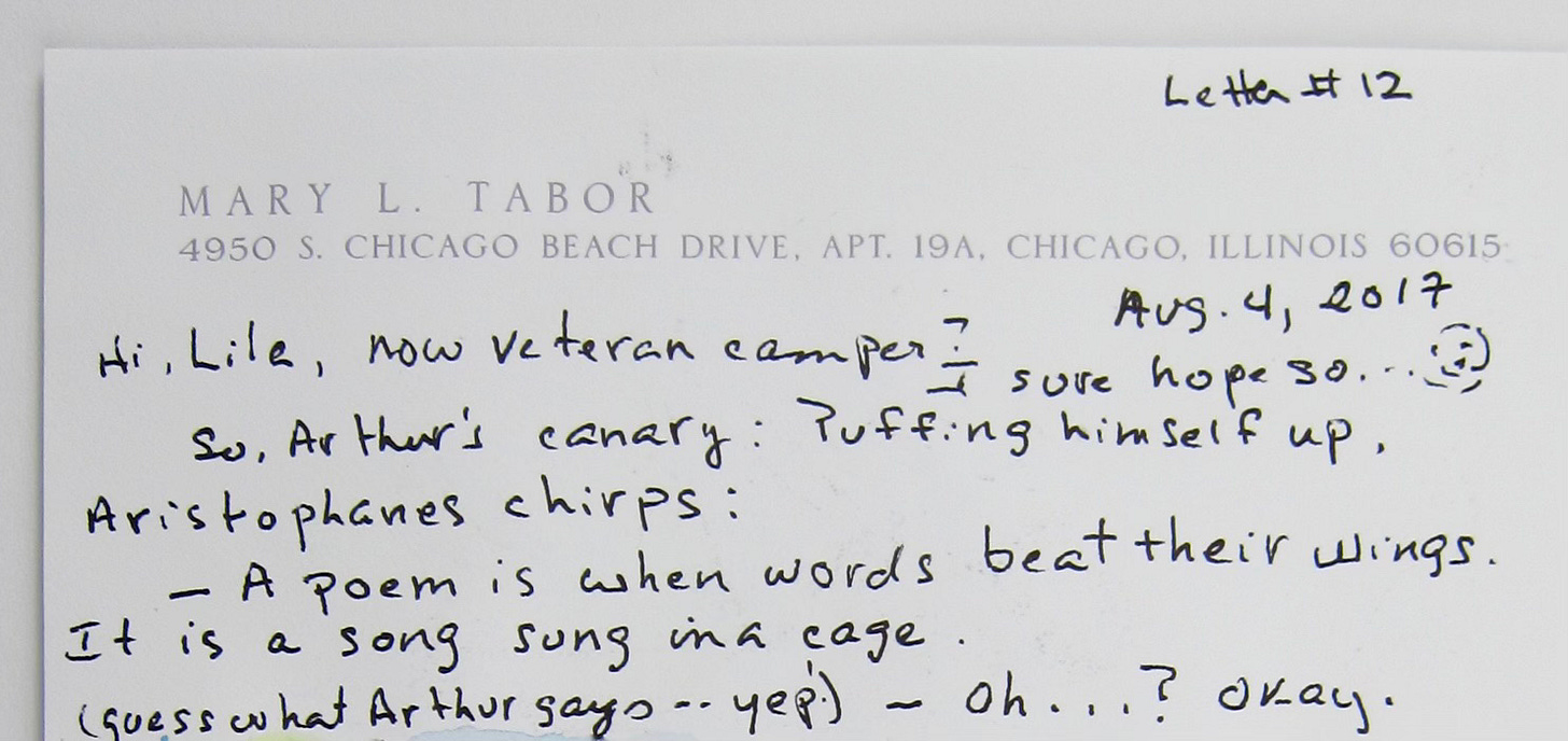 I wrote letters every day while my granddaughter was in sleep-away camp for the first time when she was eight years old. I was reading the wonderful book This Is A Poem That Heals Fish by poet Jean-Pierre Siméon (full details in the Table of Contents).